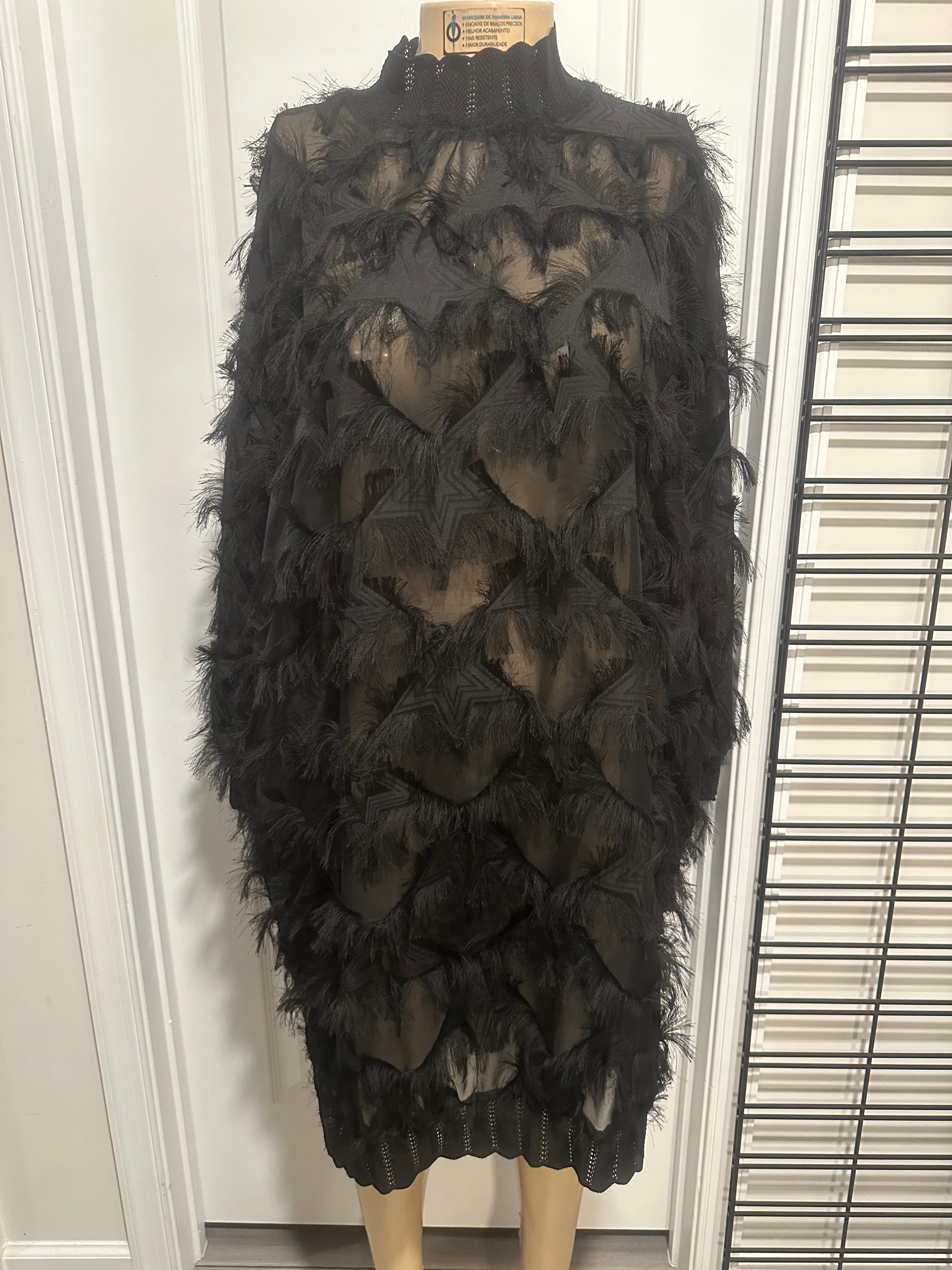 Black Heart Feather Mesh Dress Elevate your evening wardrobe with this striking mesh dress, featuring an intricate heart and feather motif in classic black. The sheer mesh construction creates a sophisticated, layered silhouette that balances elegance with contemporary edge. Perfect for cocktail events, nights out, or fashion-forward occasions, this piece delivers dramatic visual interest while maintaining refined appeal. The delicate detailing ensures you'll stand out while maintaining an air of understated luxury.