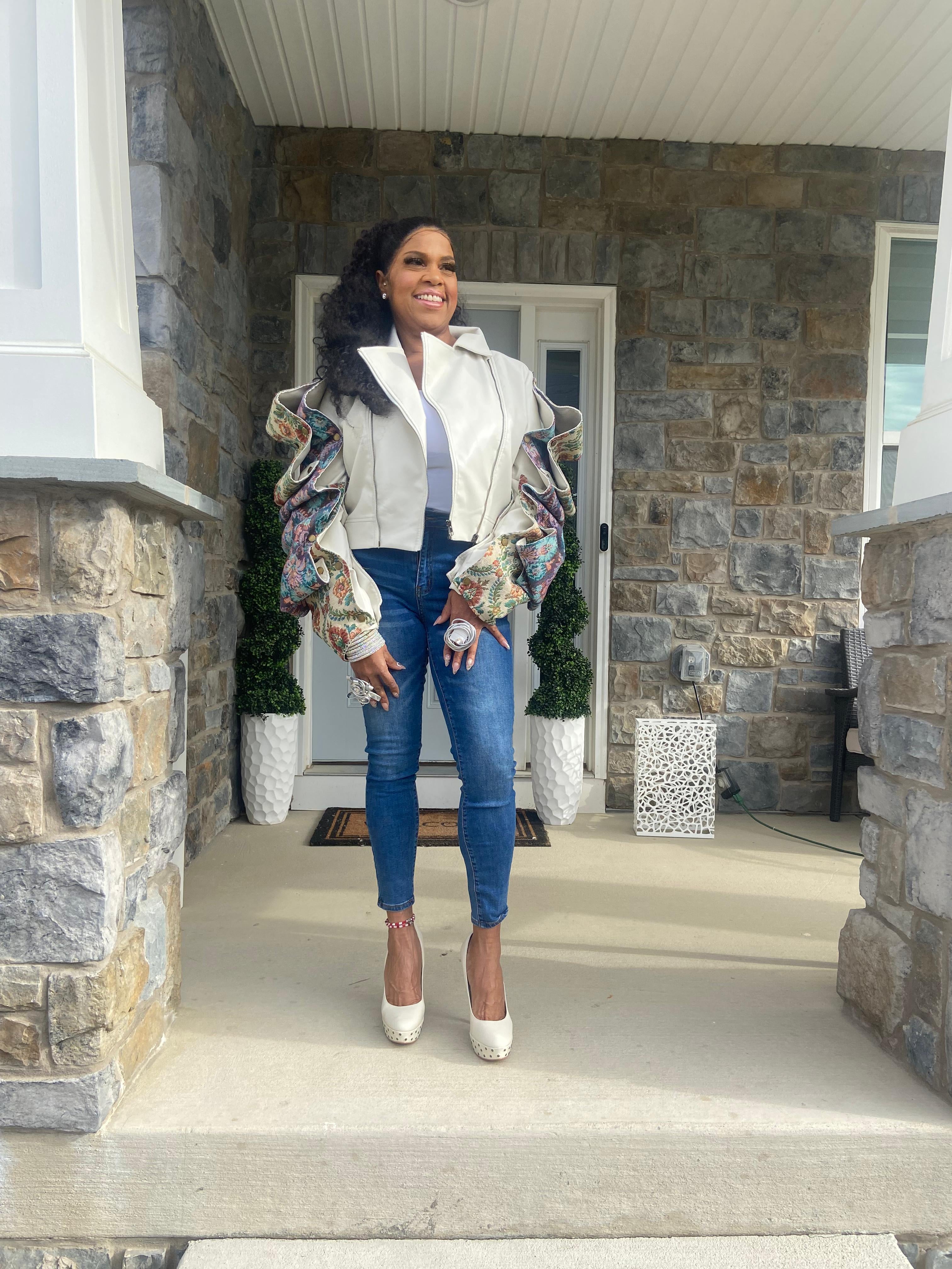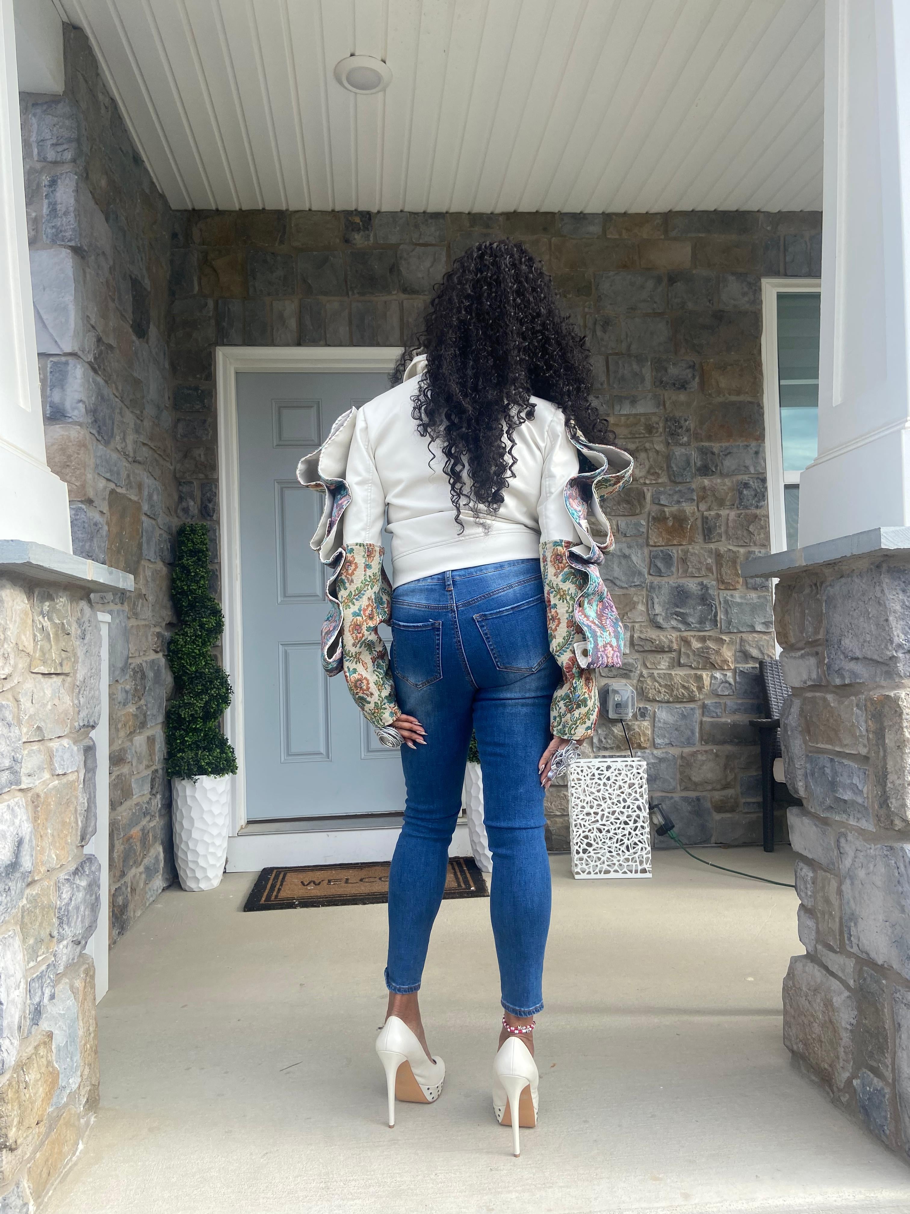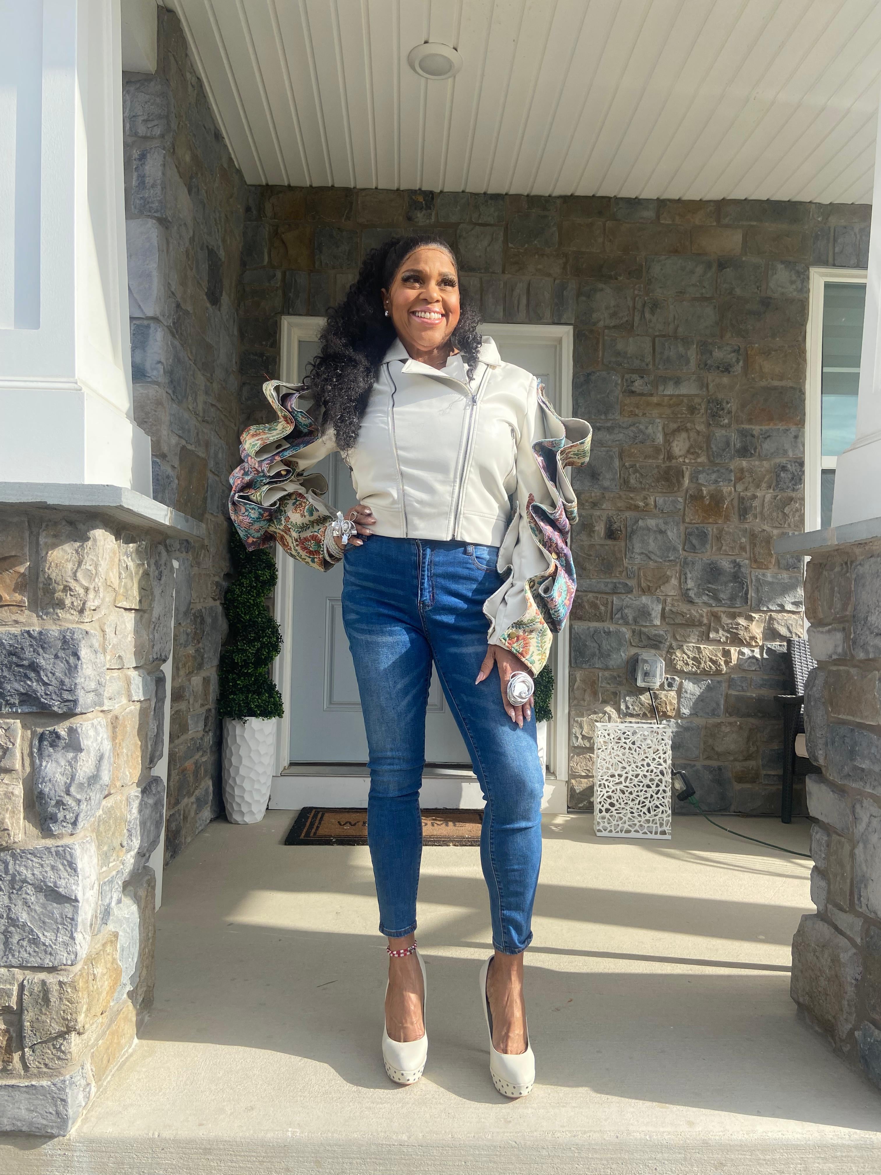 This fun bone faux leather jacket has all the extras when you want to bump your fashion up a notch. Model wearing Medium.