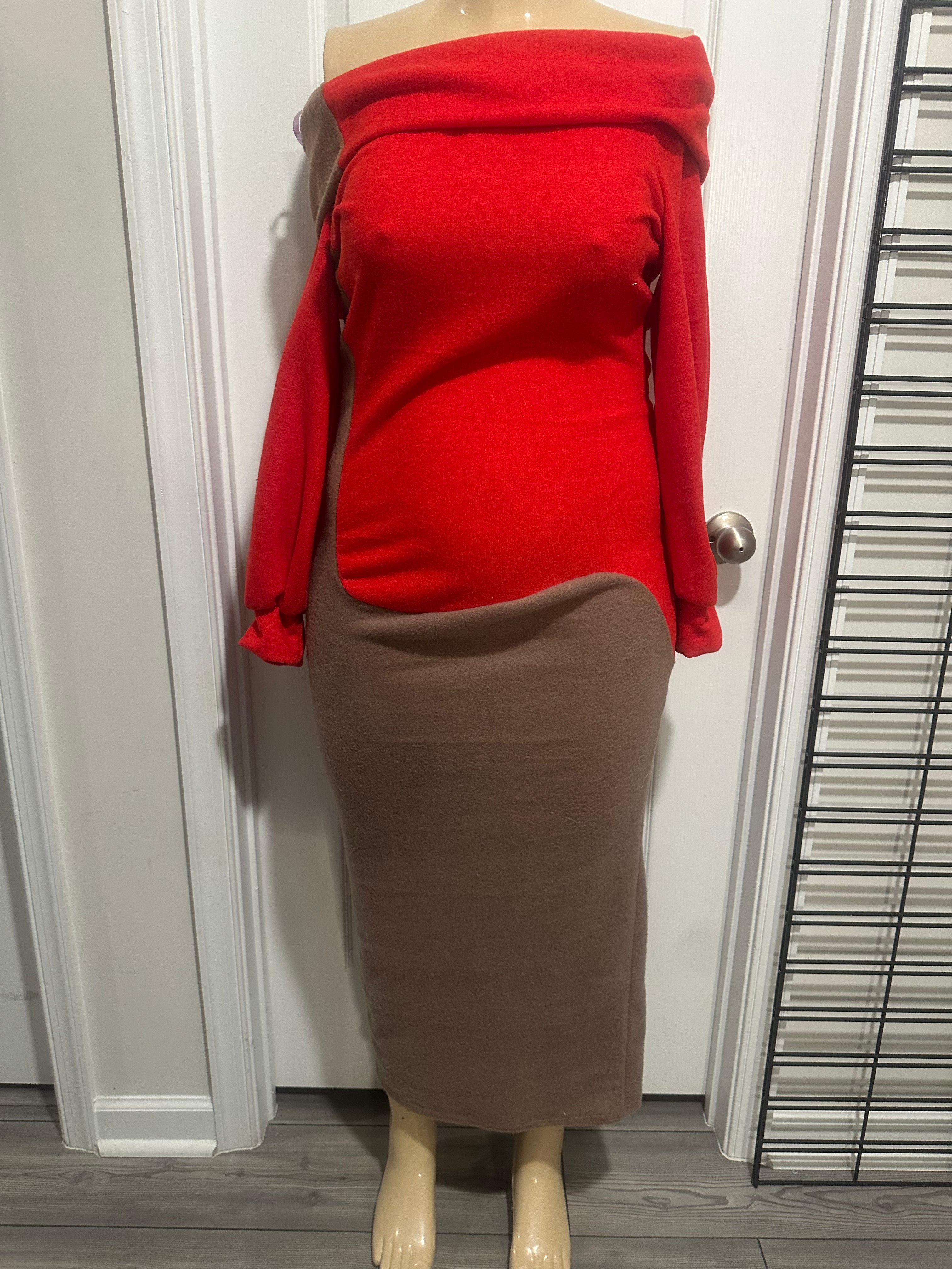 Red & Brown Off Shoulder Sweater Dress This versatile sweater dress combines warmth with contemporary style. The off-shoulder neckline creates an effortlessly chic silhouette, while the rich red and brown colorway offers sophisticated versatility for layering or standalone wear. Crafted from soft sweater knit, it transitions seamlessly from casual weekends to polished evenings. Perfect for those seeking a statement piece that balances comfort with refined elegance.