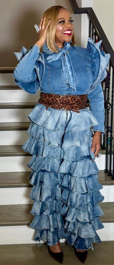 Experience a stylish twist on the classic button down shirt with our Ruffled Shoulder Button down denim top. Made with high-quality denim for a comfortable fit, the ruffled shoulder design adds a touch of femininity to your look. Perfect for both casual and formal occasions, this top will elevate any outfit.