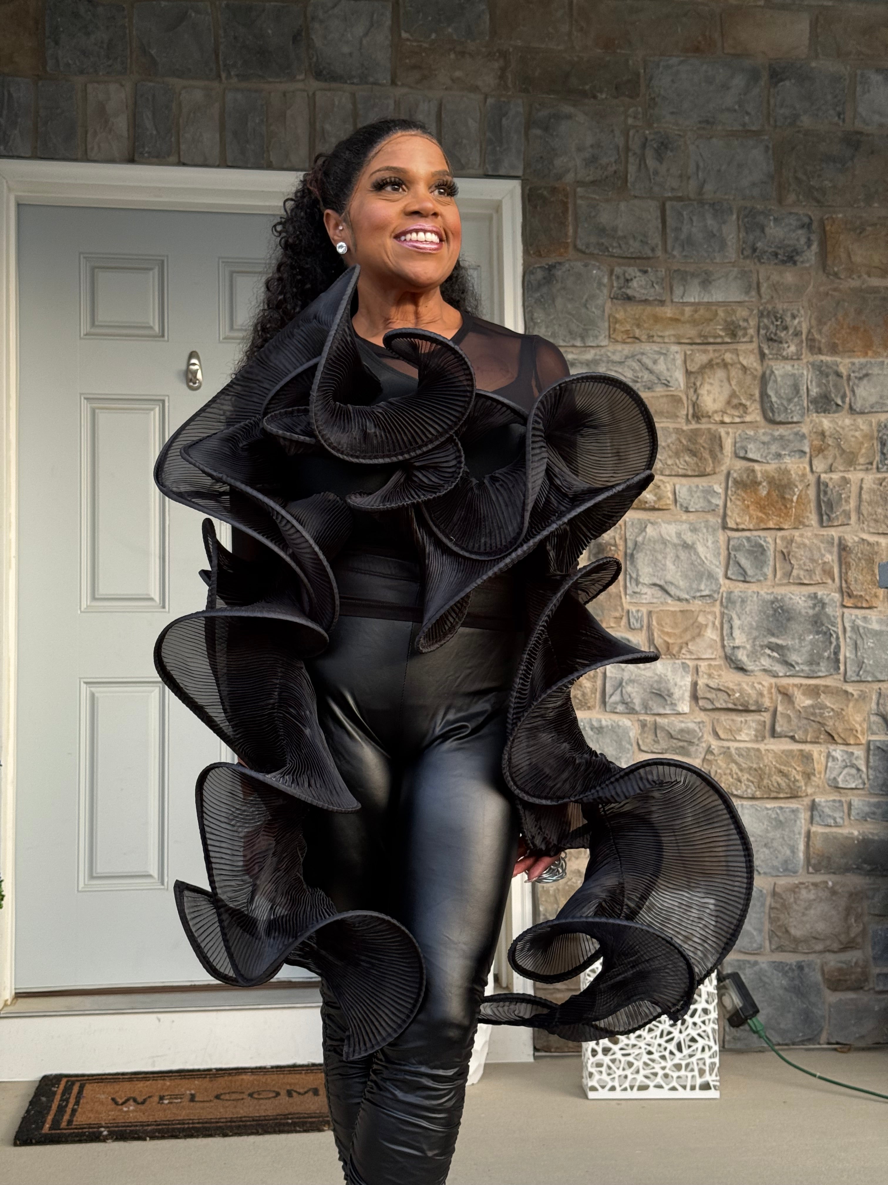 Black dramatic ruffles top. Top is 2 pieces including a sheer long sleeve top and one shoulder ruffle top. Models are wearing Small and 3X.