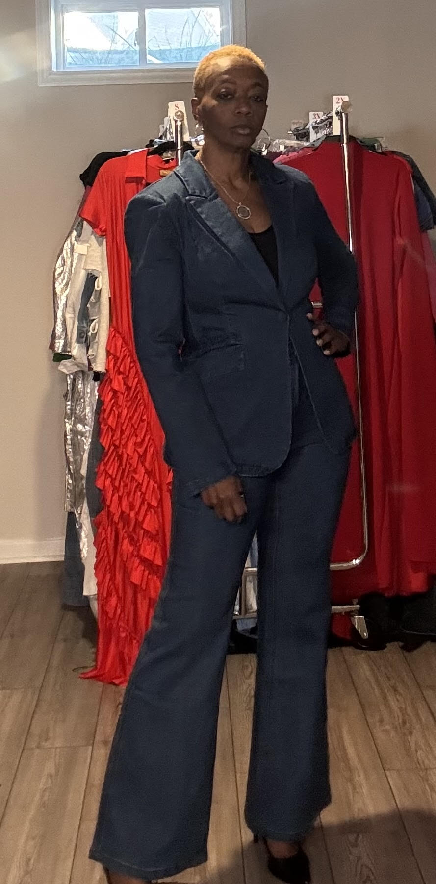 Crafted from a cotton blend with stretch, this single-button blazer and wide-leg pants suit offers a polished, confident look. Ideal for work or social events, it pairs effortlessly with heels or boots to enhance your style.
