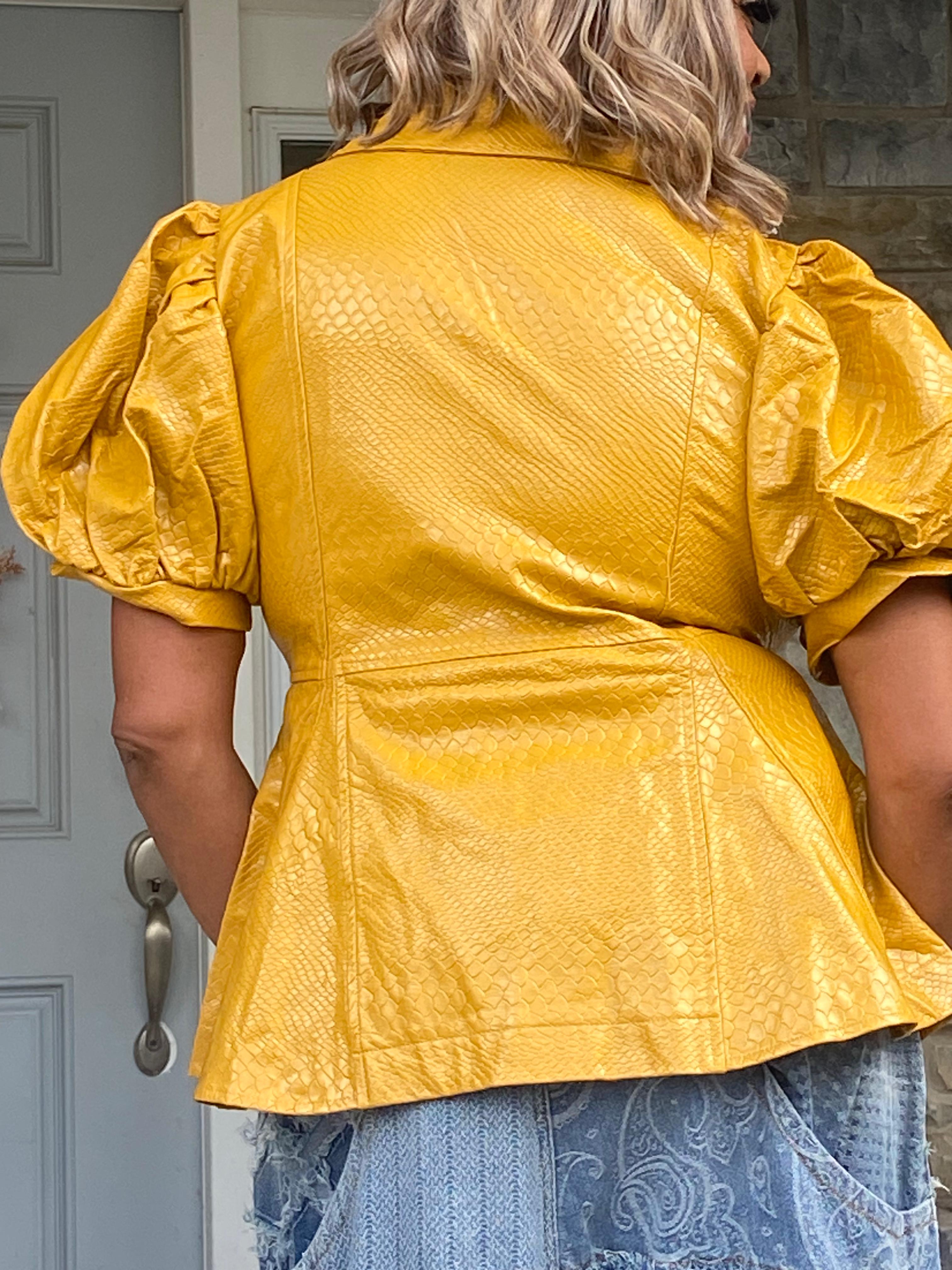 Elevate your wardrobe with this Yellow Faux Leather Peplum Top, expertly crafted for a flattering silhouette. The structured peplum detail accentuates the waist, while the vibrant yellow faux leather offers a bold, modern edge. Perfect for both professional settings and chic evening outings, this top combines style with easy maintenance, ensuring lasting appeal without compromising comfort. Model wearing Large.