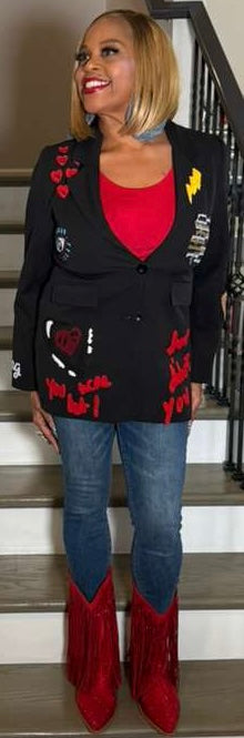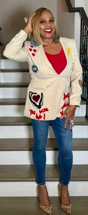 This blazer adds a touch of sophistication to any outfit with its graphic design, available in black or cream. Made with high-quality materials, it is both stylish and durable. Perfect for formal occasions or elevating your everyday look.